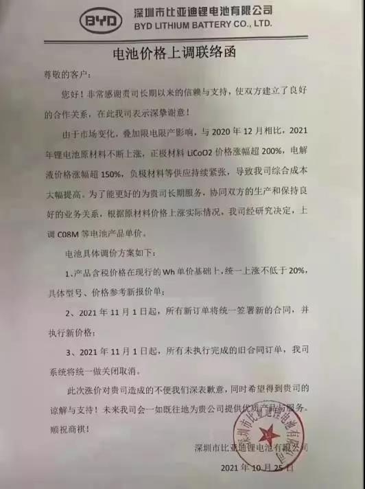 深圳市比亞迪鋰電池有限公司電池價(jià)格上調(diào)聯(lián)絡(luò)函尊敬的客戶:您好!非常感謝貴司長期以來的信賴與支持,使雙方建立了良好的合作關(guān)系,在此我司表示深摯謝意!由于市場(chǎng)變化,疊加限電限產(chǎn)影響,與2020年12月相比,2021年鋰電池原材料不斷上漲,正極材料LiCoO2價(jià)格漲幅超200%,電解液價(jià)格漲幅超150%,負(fù)極材料等供應(yīng)持續(xù)緊張,導(dǎo)致我司綜合成本大幅提高。為了能更好的為貴司長期服務(wù),協(xié)同雙方的生產(chǎn)和保持良好的業(yè)務(wù)關(guān)系,根據(jù)原材料價(jià)格上漲實(shí)際情況,我司經(jīng)研究決定,上調(diào)C08M等電池產(chǎn)品單價(jià)。電池具體調(diào)價(jià)方案如下:1、產(chǎn)品含稅價(jià)格在現(xiàn)行的Wh單價(jià)基礎(chǔ)上,統(tǒng)一上漲不低于20%,具體型號(hào)、價(jià)格參考新報(bào)價(jià)單:2、2021年11月1日起,所有新訂單將統(tǒng)一簽署新的合同,并執(zhí)行新價(jià)格;3、2021年11月1日起,所有未執(zhí)行完成的舊合同訂單,我司系統(tǒng)將統(tǒng)一做關(guān)閉取消。此次漲價(jià)對(duì)貴司造成的不便我們深表歉意,同時(shí)希望得到貴司的諒解與支持!未來我司會(huì)一如既往地為貴公司提供優(yōu)質(zhì)產(chǎn)品與服務(wù)。順祝商祺!深圳市比亞迪鋰電池有限公司2021年10月25日